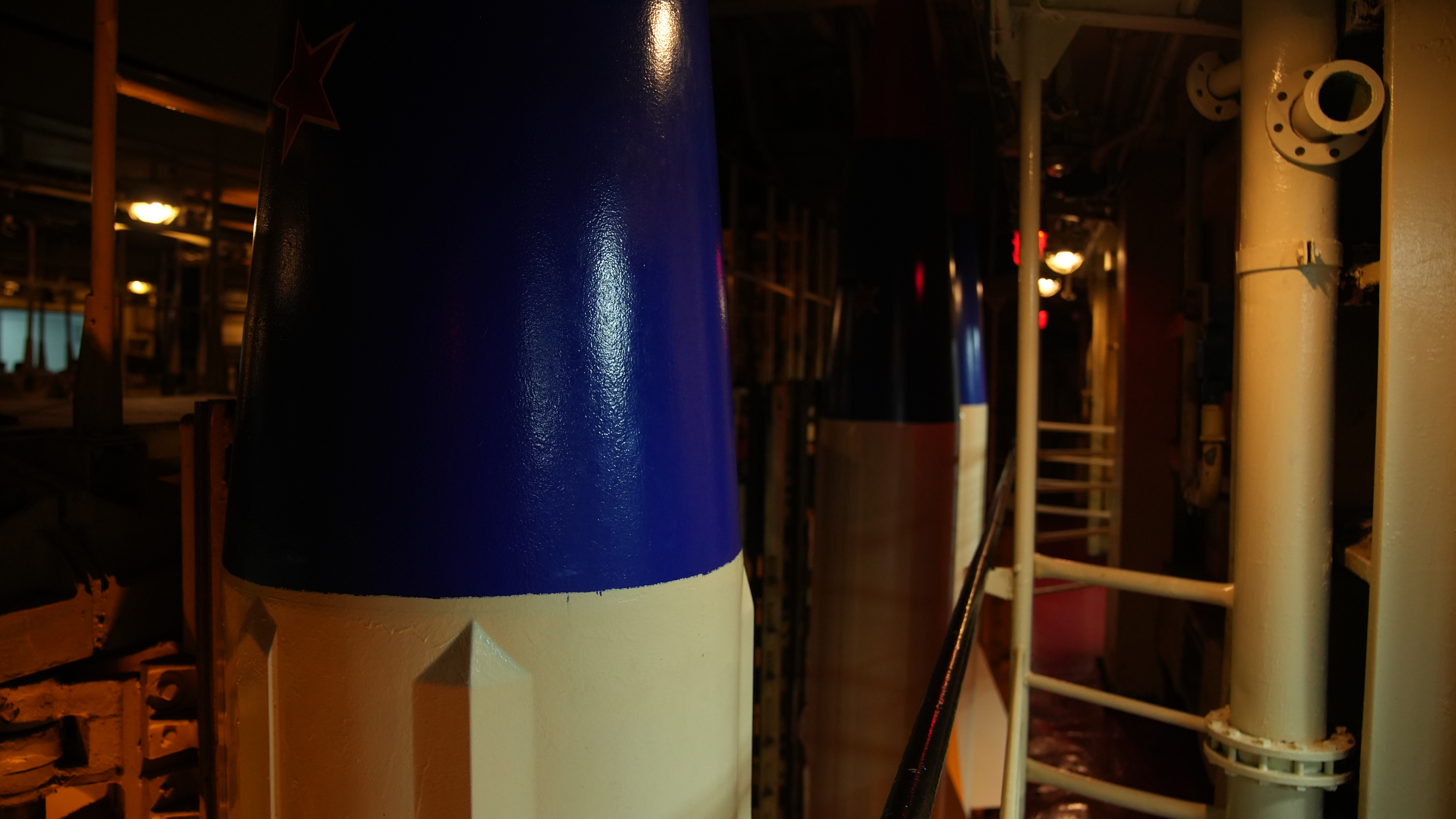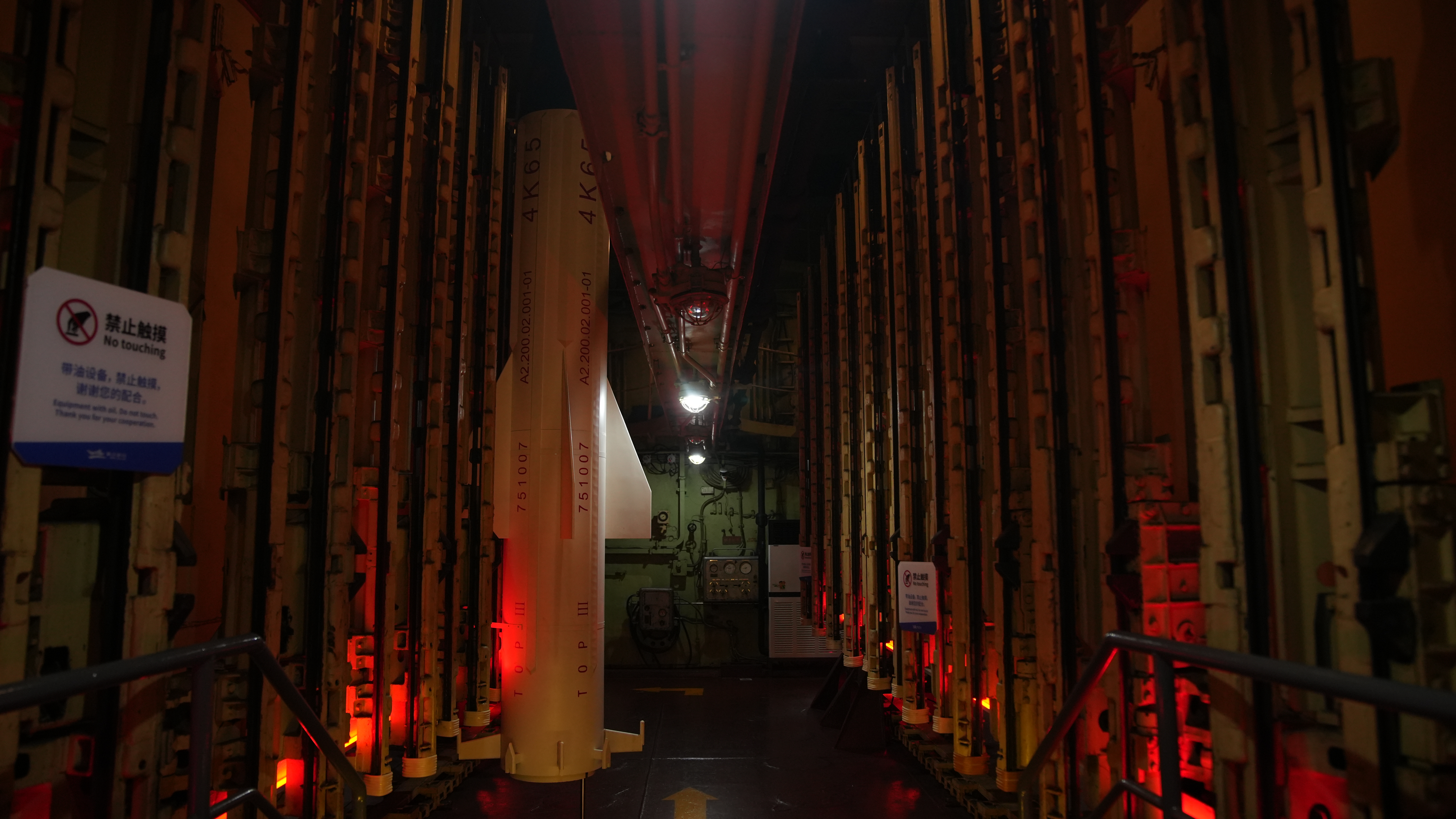 垂直貫穿于二甲、三甲,存放對(duì)空導(dǎo)彈。導(dǎo)彈置于可旋轉(zhuǎn)彈架,庫(kù)內(nèi)自動(dòng)裝彈機(jī)能自動(dòng)向發(fā)射架裝填導(dǎo)彈,每3秒就可完成2枚導(dǎo)彈的裝填。